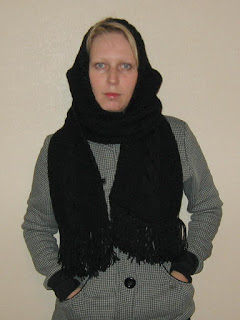 Сначала пришила капюшон (прямоугольник) к шарфу и только потом сшила шов на самом капюшоне сверху. Один конец шарфа короткий, а второй длинный, чтоб вокруг шеи заматывать. Длина шарфа без кисточек 165 см. Длинный конец шарфа можно заложить на плечо или оставить два конца спереди. Примеряла для фото на себя.
